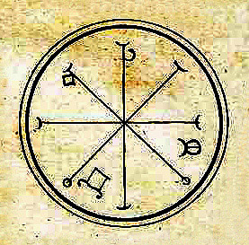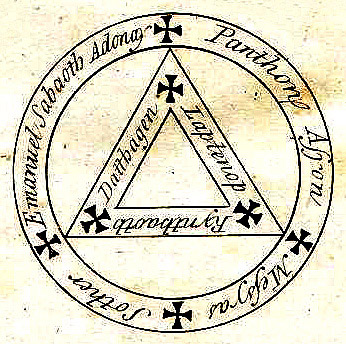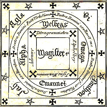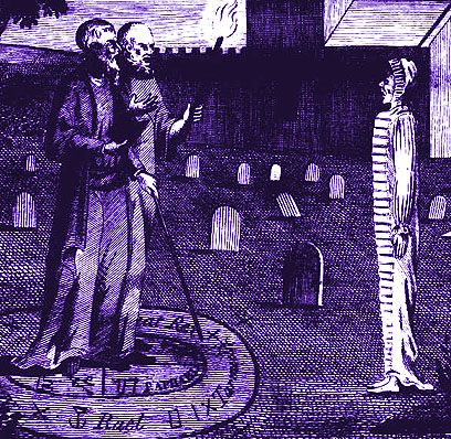 Pictures are digitally altered versions of images originally scanned by Liam Quin. Top image depicts magician Edward Kelly invoking the spirit of a deceased person. Symbols are "magical circles, seals and characters." All images taken from "The Everyday Book and Table Book," William Hone, 1826, London.