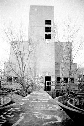 Some buildings are alive, bustling with activity and purpose. Others are dead, deteriorating and empty.But the "Equadome" was a zombie a living dead building that stood vacant 50 years while devilish deeds stirred within it decaying walls. If St. Charles County had a "bad place," it was the concrete husk that stood off Highway 94 on what is now a firing range for the sheriff's department. Its name, when it was alive, was Water Treatment Plant No. 2. The main structures included an office building, two lime storage towers, and a water tower. The federal government began building the plant in 1941 to purify water used to make TNT at the Weldon Spring Ordnance Works. The plant was "born" upon its completion in October, 1942. It pumped between 20 and 38 million gallons of water per day throughout World War II. The plant "died" when the government shut it down in 1946. But it did not stay dead. The plant became a legendary hangout for young people. Rumors spread that Satanic cults performed occult rituals and animal sacrifices within its cavernous chambers. The lure of mystery and danger attracted more thrill-seeking teens year after year. Some dubbed the plant the "Echo Dome." Others called it the "Aqua Dome." In time, the nicknames merged into one the Equadome. |